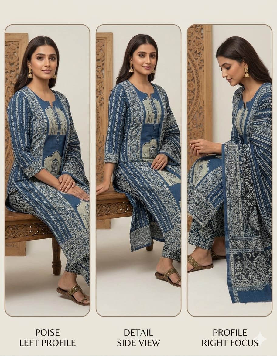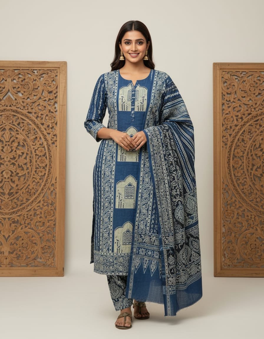 Celebrate timeless tradition with this elegant Ajrakh Print Suit Set, crafted from pure cotton fabric for ultimate comfort and style. Featuring beautiful Ajrakh-inspired prints in three stunning color options, this set is perfect for everyday wear as well as ethnic occasions. The breathable cotton fabric ensures all-day ease, while the matching cotton bottom and soft mul cotton dupatta complete the look with grace and sophistication.