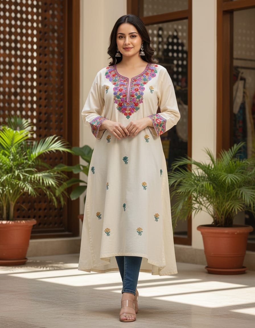 Add a touch of timeless grace to your wardrobe with this beautiful Kashmiri Cotton Kurti in a soothing cream shade. Crafted from soft, breathable cotton, this kurti is adorned with delicate Kashmiri-style embroidery that reflects rich traditional artistry. The subtle color combined with intricate detailing makes it perfect for everyday elegance as well as festive occasions.