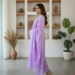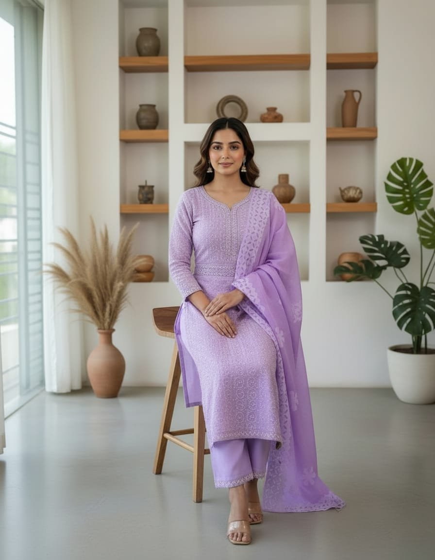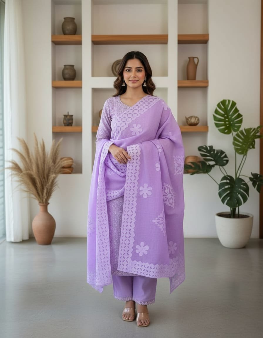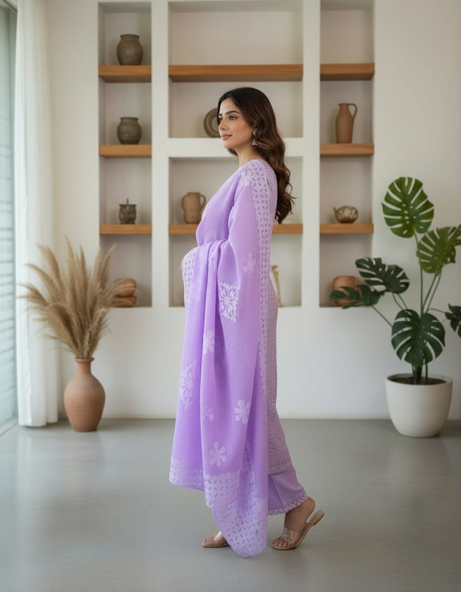 Step into timeless grace with this exquisite Unstitched Suit Set, crafted from a premium breathable cotton-organza blend that offers both comfort and sheer elegance. The kameez is adorned with handcrafted appliqué and delicate floral cut-work embroidery, creating a refined and luxurious appeal. Paired with a matching salwar and a beautifully designed dupatta featuring heavy cut-work borders and intricate floral motifs, this ensemble is perfect for festive occasions, parties, or elegant day wear. The soft lavender/lilac shade adds a touch of sophistication and charm to your look.