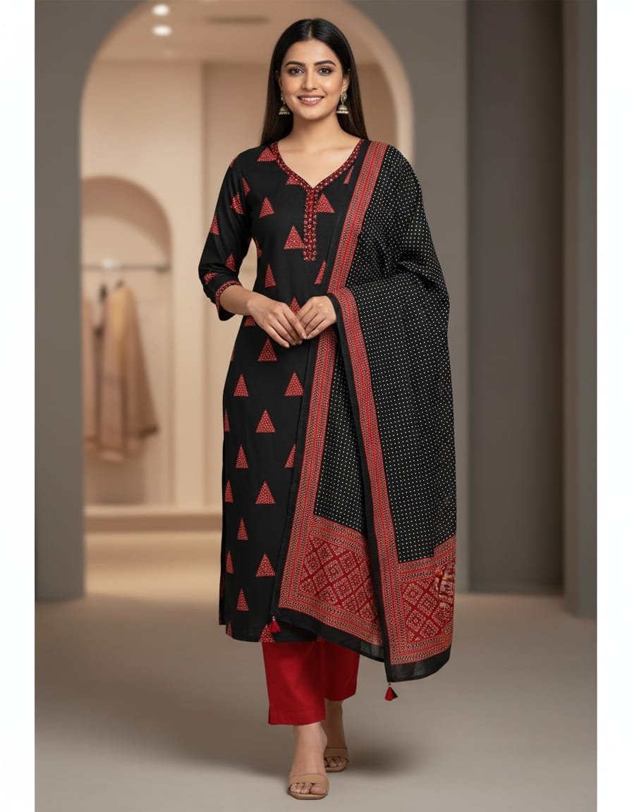 Add a touch of contemporary charm to your wardrobe with this elegant Pure Cotton Suit, designed with unique triangular patterns and highlighted by beautiful mirror work on the neck. Crafted from soft, breathable cotton, this outfit ensures all-day comfort while keeping your style effortlessly trendy. The subtle shine of mirror detailing enhances the neckline, making it perfect for casual outings, office wear, or small festive gatherings.